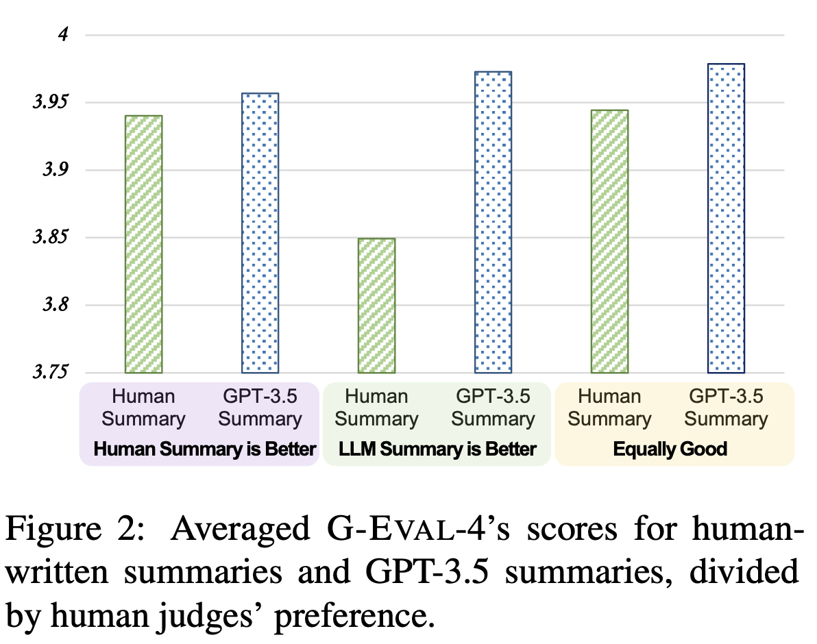 G-Eval-4 에게 사람의 요약과 GPT-3.5의 요약의 품질을 비교하라고 했을 때, 항상 GPT-3.5의 요약을 선호하는 결과를 보였다. (= 편향이 있다)