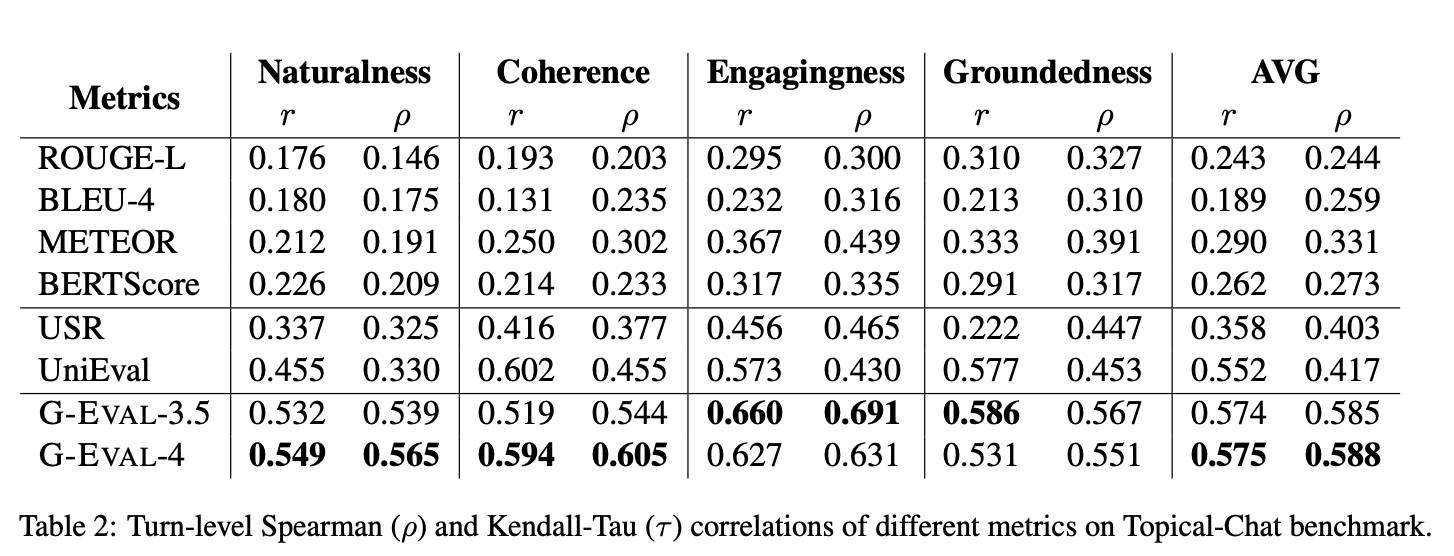 LLM-based metrics는 기존의 reference-based/free metrics보다 인간 평가와의 상관관계가 높다. 특히 dialogue response generation(대화 응답 생성) 개방형, 창의적인 NLG 작업에서 우수하다.