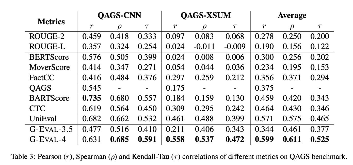 SummEval, QAGS 벤치마크에서 모델 크기에 따라 비교했을 때 G-Eval-4가 G-Eval-3.5보다 더 높은 상관관계를 보인다.