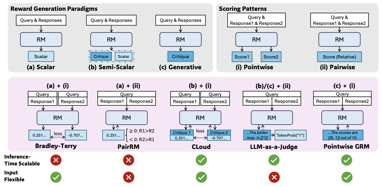 보상 모델의 추론 시점 확장성은 같은 입력에 대해 여러 번 샘플링하여 다른 보상 결과를 얻을 수 있는지에 따라 결정된다. 예를 들어, scalar 방식을 사용하는 RM은 항상 같은 보상 값을 생성하기 때문에 확장성이 부족하다.
