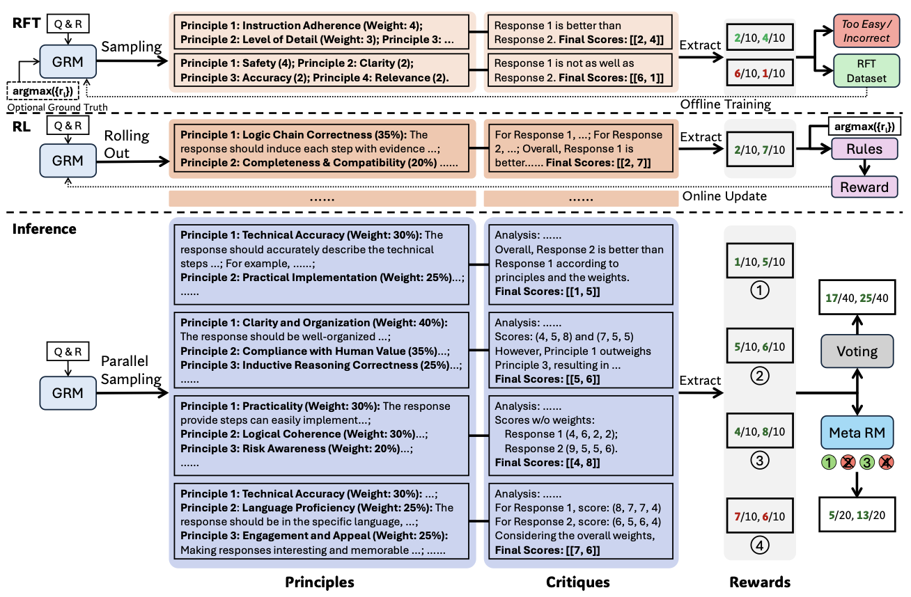 rule-based online RL을 활용하여 GRM이 스스로 principle을 생성하고, 응답에 대한 critique를 생성하여 보상 신호를 더 정교하게 생성할 수 있도록 학습시킨다.