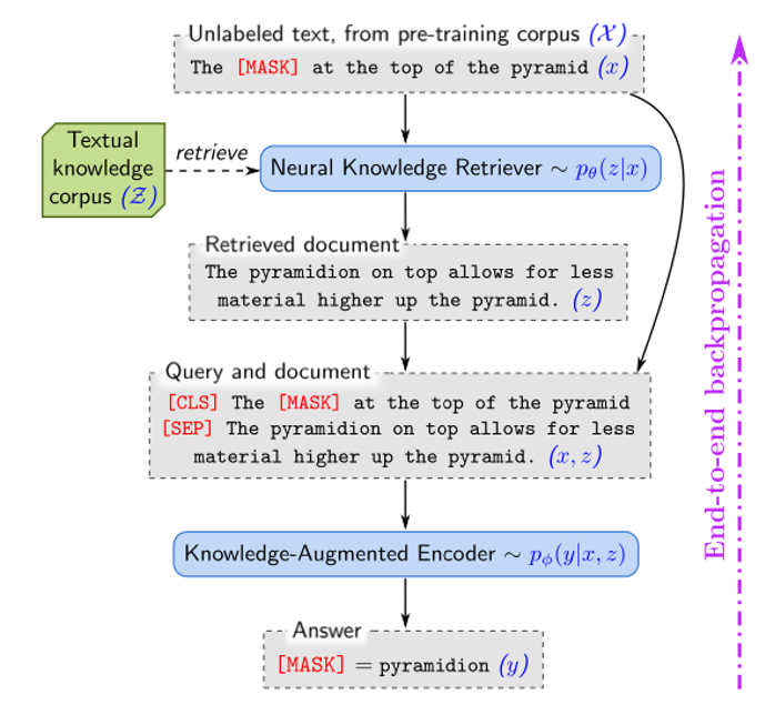 예를 들어 위의 그림에서 model이 “the ___ at the top of the pyramid”의 빈칸을 채워야하는 경우, retriever는 “The pyramidion on top allows for less material higher up the pyramid.”라는 document를 선택하면 보상을 받는다.