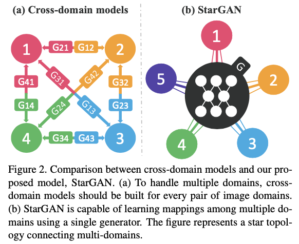 한 번에 도메인 두 개씩 학습 가능. 멀티도메인에 확장성이 낮다.(너무 많은 쌍의 도메인이 학습되어야 함)