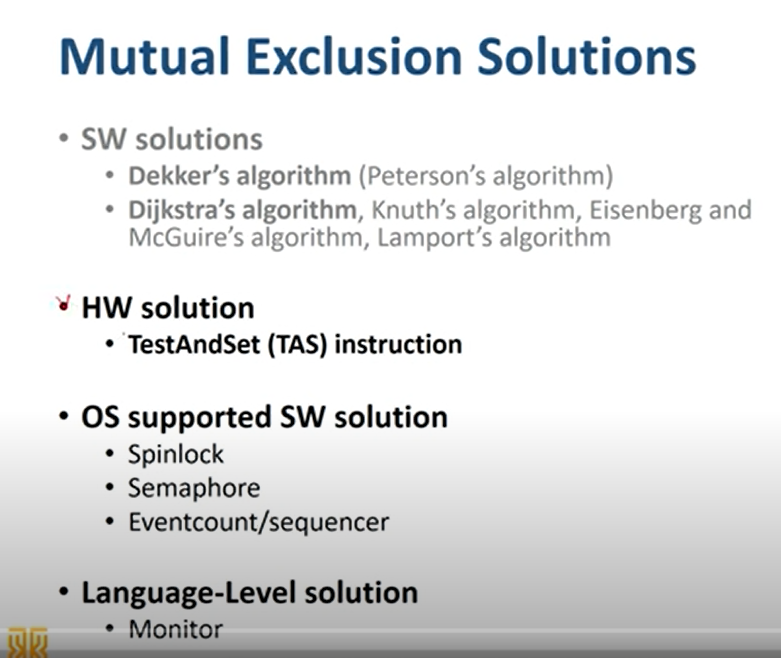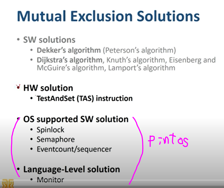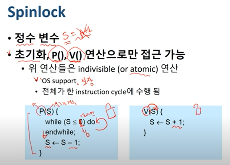 spinlock은 busy waiting 문제 존재, 멀티코어에서만 사용 가능