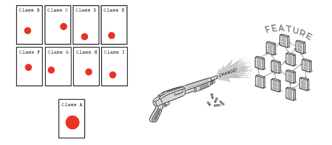 하나의 기능이 여러 기능에 영향을 주는 경우, 하나를 바꾸면 다 수정을 해야하는 경우