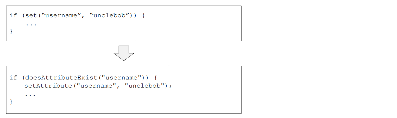 if (set("username", "unclebob"))... 와 같이 활용을 한다고 하면 이는 호출자가 "username"이 "unclebob"으로 기존에 설정되어 있었던 것인지, 또는 unclebob으로 설정이 성공했는지를 말하는 것인지 혼란스럽게 만든다