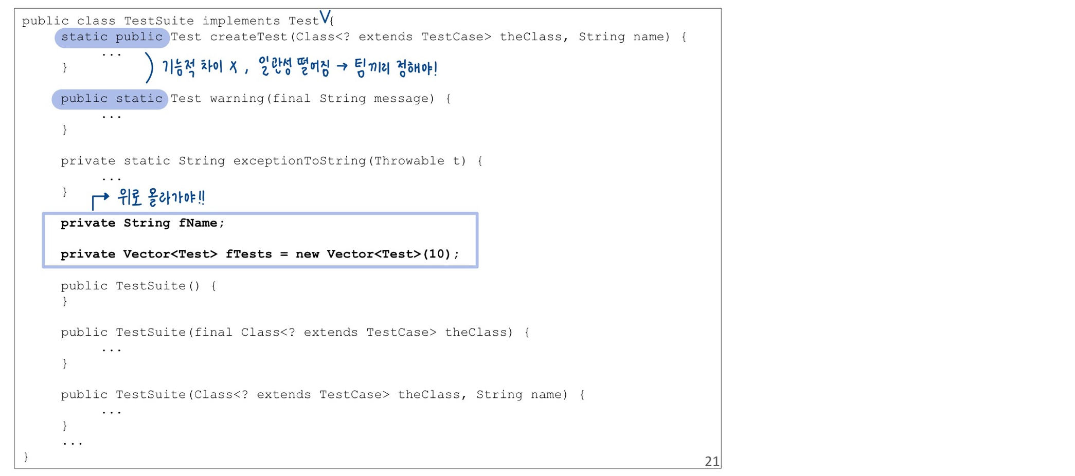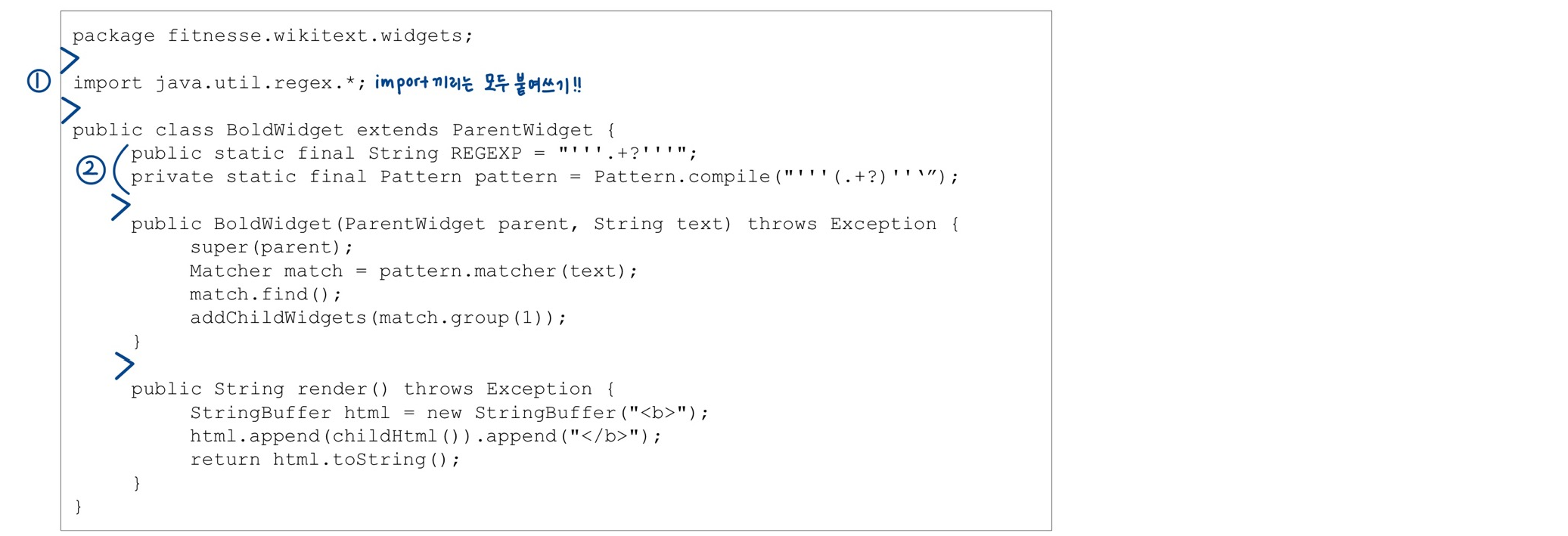 findJavaFiles(parentDirectory, files);에서 output argument를 사용하고 있다. 본래 output argument는 단 한 가지 경우를 빼놓고 사용하면 좋지 않다고 했는데, 그 한 가지 경우가 이것에 해당한다. 바로 recursive 함수에서는 boolean으로 결과를 잘 알리는 것이 어렵기 때문에 output argument가 필요하다!file.getName().endsWith(".java")는 chain을 형성하는 코드이다. 이는 뒤에 뭐가 어떤 파일들이 따르는지도 알고 있음을 명시하고 있다. 너무 tight하게 연관되어 있는 경우이므로 리팩토링이 필요하다.file.doesNameEndWith로 수정이 가능하다!measureLine(line)가 step down rule을 잘 보여주고 있다. 함수 호출을 한 후 바로 아래 해당 함수가 정의되어 있기 때문line.length는 짧은 코드인데 굳이 변수에 저장을 해서 사용하는 이유가 궁금할 수 있다. 하지만 두 번 사용하고 있기 때문에 변수 선언을 해서 중복 제거를 한 것!