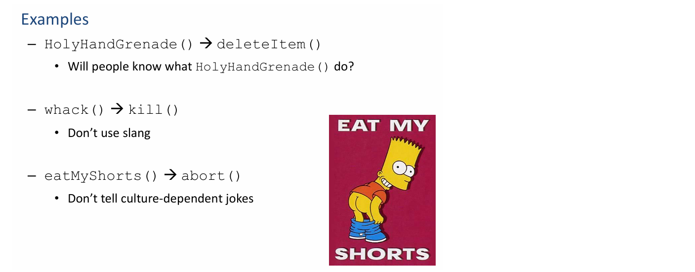 무슨 말이냐하면, 예를 들어 DB에서 데이터를 가져와야할 때 fetch()라고 했다가 retrieve()라고 했다가 get()이라고 했다가 하지 말라는 것이다. 일관성 있게 사용할 것!