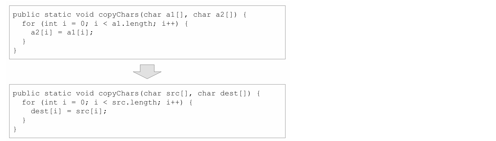 루프에 사용되는 i,j,k 같은 이름은 허용되지만, 중요한 변수는 검색하기 쉬운 이름을 사용하는 것이 좋다