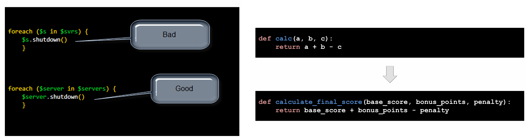 예를 들어, i,j,k를 for문에서 사용했을 때 i는 각 server, j는 각 client, k는 각 service를 나타낸다고 했을 때, for문을 돌때 독자는 머릿속에서 계속 매핑을 해야할 것이다