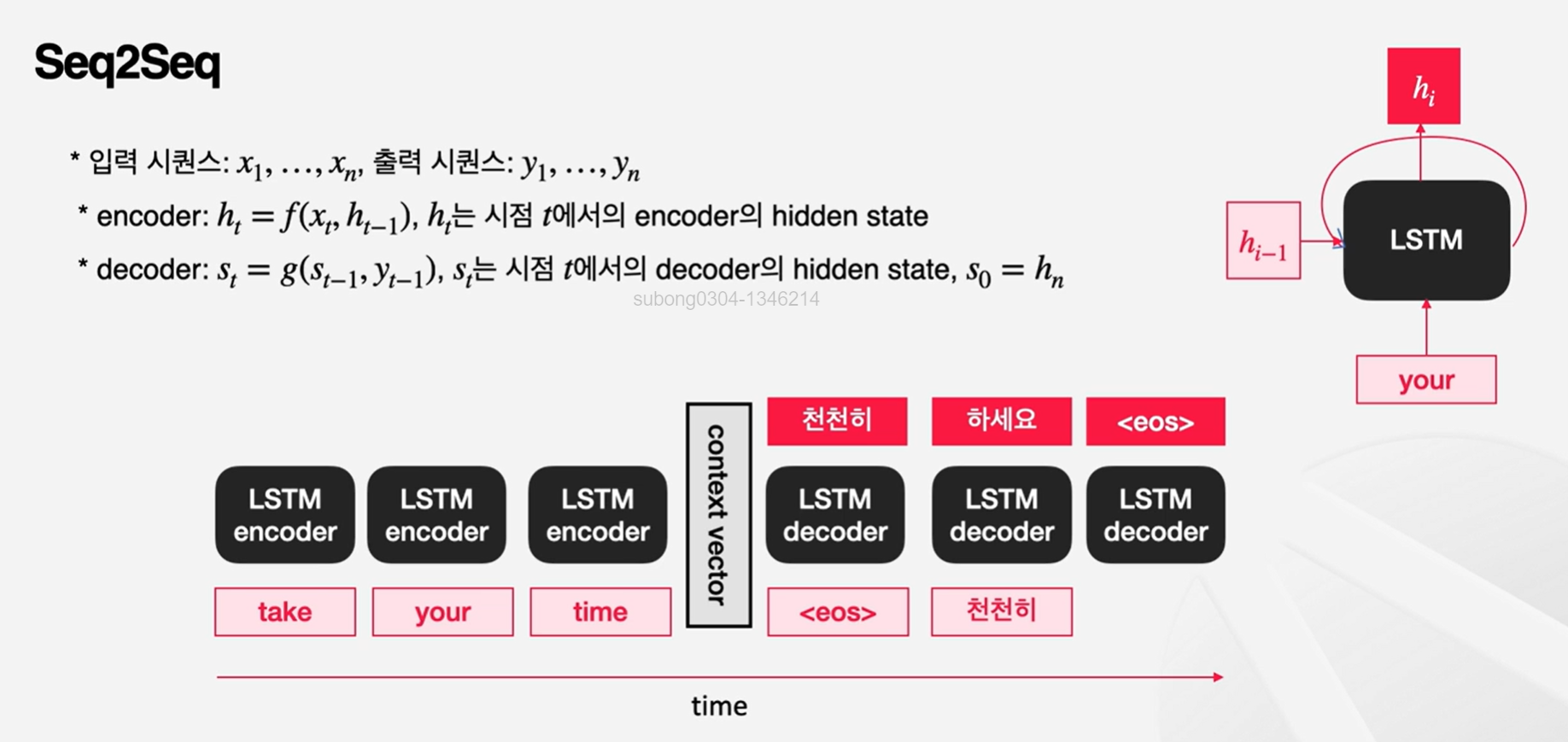 seq2seq : 인코더, 디코더를 가지고 있는 모델로, 순차적인 데이터를 입력받아 순차적인 데이터를 출력하는 모델