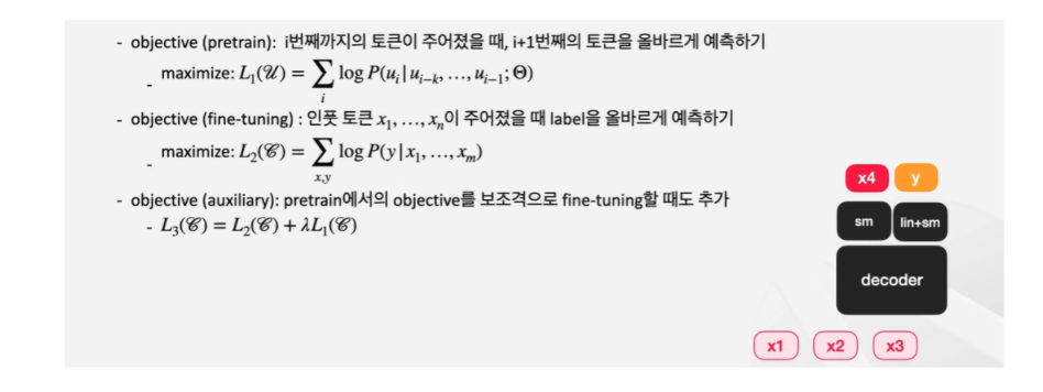 BERT의 사전 학습과 달리 Next Word Prediction 기법 을 사용한다. 이전의 토큰들이 있을 때 다음의 토큰을 예측하는 방식이다. 레이블링 되지 않은 케이스에서도 학습한 문제를 만들어낼 수 있게 된다.