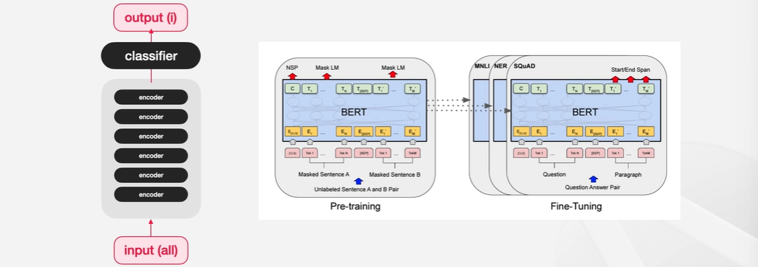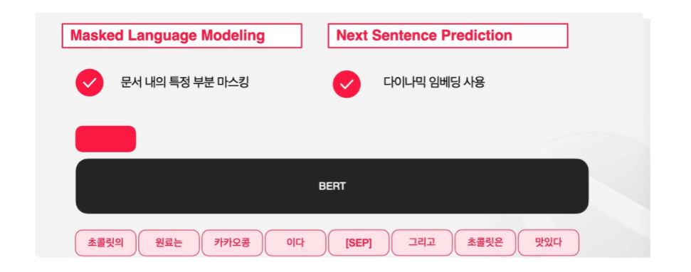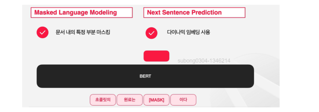 BERT는 빈칸에 해당하는 [MASK] 토큰이 가지는 임베딩을 가지고 해당 Mask 토큰이 원래 무엇인지를 예측하는 방식으로 pre-traning을 한다.