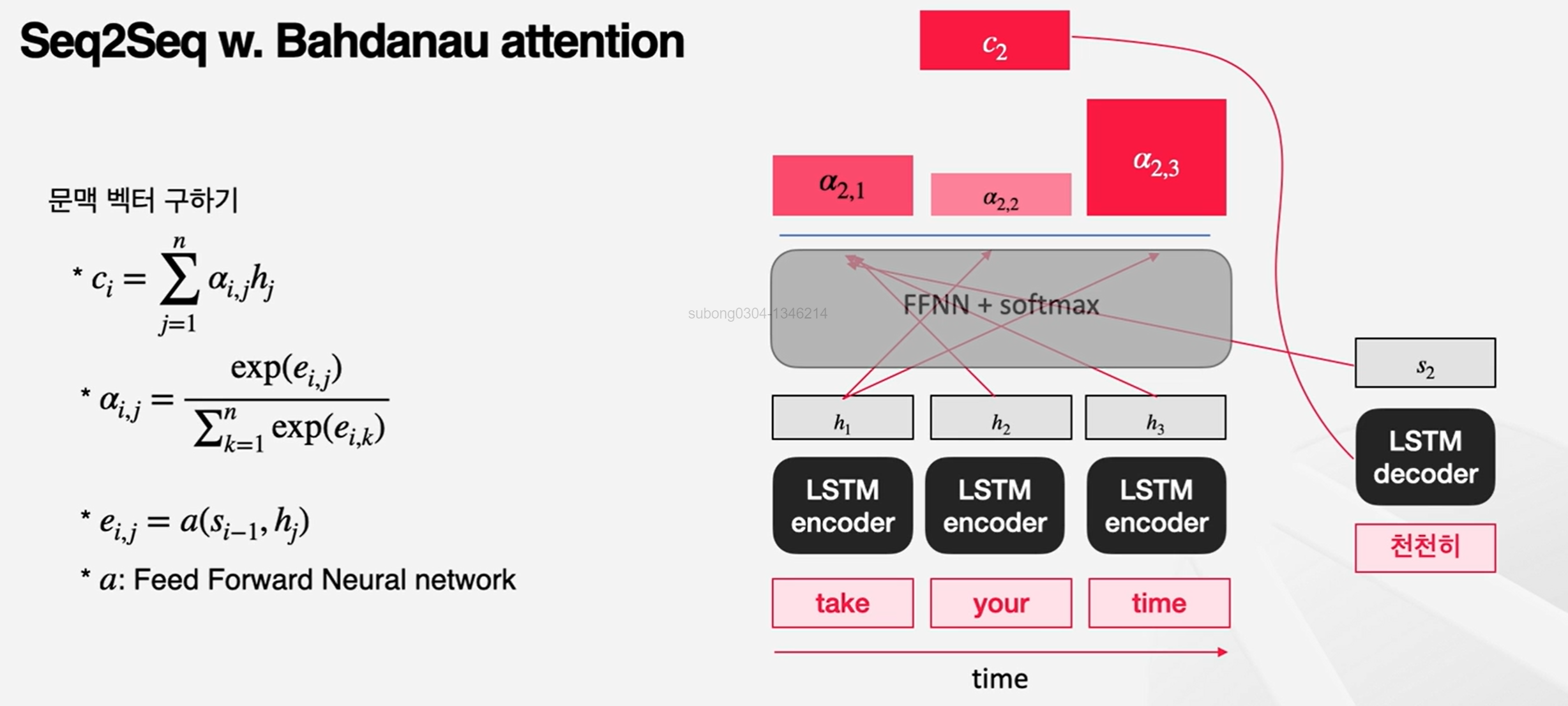 Take, your, time이라는 input이 들어온 상황이고, 디코더단에서 토큰을 생성하는 중에 나올 수 있는 그림이다. '천천히'라는 토큰이 이전에 생성되었을 때 다음 토큰을 생성하기 위해서 세 토큰 중에 어떤 것을 얼마나 참조해야 되는지 알고 싶은 상황인 것이다.
