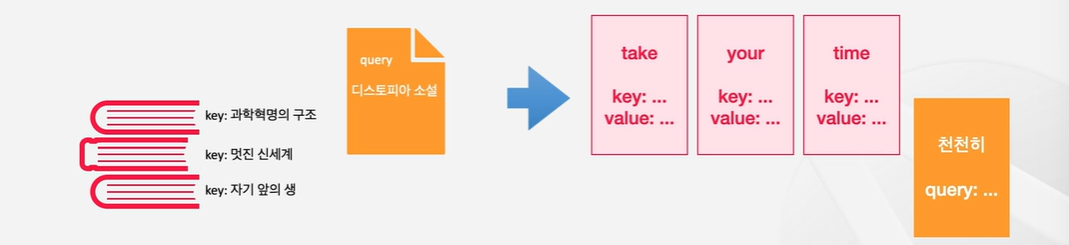 만약 서점에서 디스토피아에 대한 책을 찾고 싶다고 해보자. 그렇다면 쿼리는 '디스토피아 소설'이라는 키워드가 될 것이다. 키는 쿼리와 대조할 수 있는 값이므로, 이 경우에는 서점 데이터베이스에 등록되어있는 메타정보(책의 제목, 저자 등)가 있을 것이다. 우리는 query를 key와 대조해서 어떤 value가 내가 필요로 하는 것인지를 찾을 수 있다.