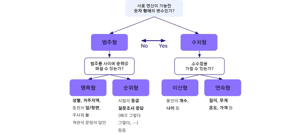 - 범주형 변수 Categorical Variable : 질적 변수라고도 하며, 가능한 여러 범주들 중 하나(또는 여러개)를 고르는 형태로 표현되는 변수