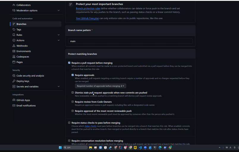 브랜치를 생성하고 rule을 설정할 수 있는데 "requrie approvals"를 1로 설정! 이건 한 명이 승인해야 merge가 된다는 말. 2로 하면 2명이 모두 승인을 해야하기 때문에 불편할 수 있다