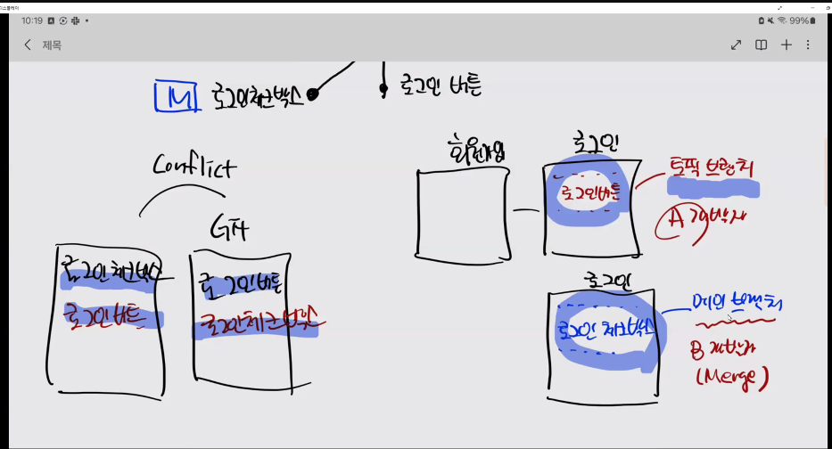 같은 파일을 두 명 이상의 사람이 변경을 할 경우, 변경사항의 순서나 선택을 Git은 스스로 하지 못한다. 이럴 때 충돌이 발생하고 사용자가 직접 충돌을 해결해줘야 한다