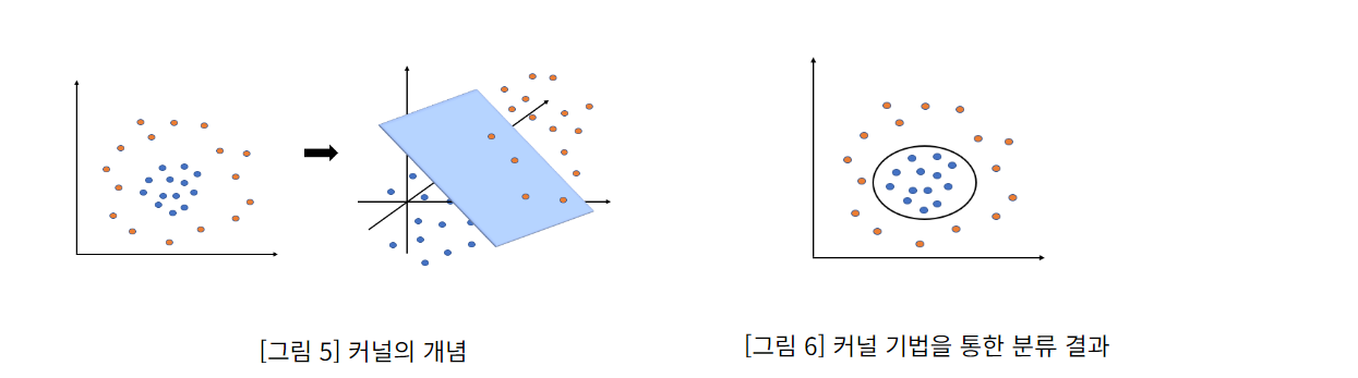 커널 기법 : 주어진 데이터를 고차원 공간으로 변환하여 선형 분류 혹은 수치 예측을 가능하게 해주는 방법이다. 즉, 커널 기법을 적용한다는 것은 벡터 간의 내적을 커널 함수로 대체한다는 것