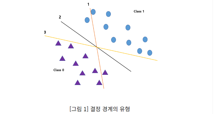 예를 들어, 아래 그림과 같이 두 클래스를 분류하는 3가지 선형 결정 경계를 만든다고 가정해보자. 1번의 경우 클래스를 제대로 분류하지 못했고, 3번의 경우 두 클래스를 제대로 분류했지만, 결정 경계선과 관측 데이터가 매우 가깝기 때문에 추후 새로운 데이터를 분류하려 할 경우 잘못 분류될 가능성이 크다. 한편, 2번 결정 경계는 두 클래스를 제대로 분류했을 뿐만 아니라, 결정 경계선과 두 클래스의 최근점 관측치 사이의 거리가 큰 폭으로 떨어져 있기 때문에 추후 새로운 데이터에 대한 분류에 대해서도 비교적 안정적인 성능을 발휘할 수 있을 것이다.