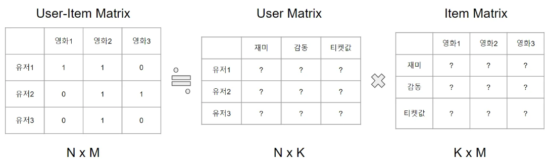 이때 k는 임의의 값이다. 원본 행렬 M은 두 개의 행렬의 곱으로 나타내지며, User Matrix와 Item Matrix는 각각 k개의 feature를 갖게 된다. 예를 들어 위 사진에서는 재미, 감동, 티켓값이라는 3개의 feature를 만들었다. 유저 행렬에는 각 유저가 재미, 감동, 티켓값 중 어떤 feature를 더 중요하게 여기는지를 수치화하고, 아이템 행렬에서도 영화가 재미, 감동, 티켓값 중 어떤 feature에 적합한지를 수치화한 뒤 유저 행렬과 아이템 행렬을 내적해서 원본 행렬을 복원하게 된다.