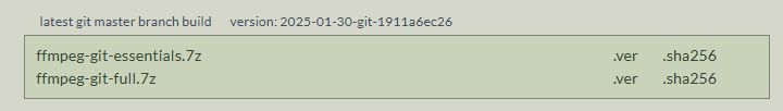 win에서는 .bat mac/Linux는 .sh를 사용하면 본인 로컬에 설치 할 수 있으나, https://www.gyan.dev/ffmpeg/builds/ 에서