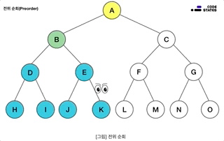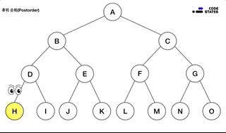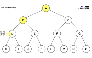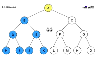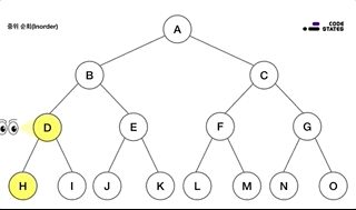 가장 먼저 방문할 노드는 루트입니다. 루트에서 시작해 왼쪽의 노드들을 순차적으로 둘러본 뒤, 왼쪽의 노드 탐색이 끝나면 오른쪽 노드를 탐색을 합니다.
