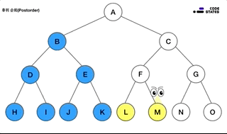 루트를 가장 마지막에 순회합니다. 제일 왼쪽 끝에 있는 노드부터 순회하기 시작하여, 루트를 거치지 않고 오른쪽으로 이동해 순회한 뒤, 제일 마지막에 루트를 방문합니다.