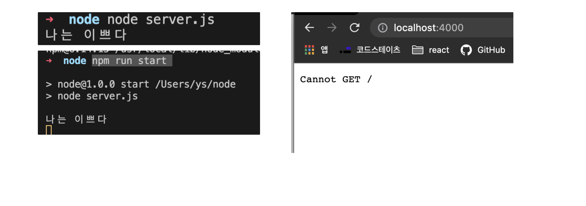 이렇게 매번 수정할때마다 재시작이 불편해서 자동화시키는 라이브러리 nodemon을 다운받아 사용하는 것을 추천한다.