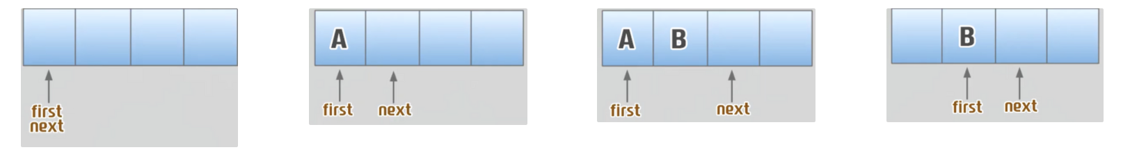 스택은 한 곳 (top) 에서만 추가, 추출이 이루어지지만, 큐는 데이터를 쌓는 곳(rear)있고 반대쪽에선 데이터를 내보내는 곳 (front)이 있다.