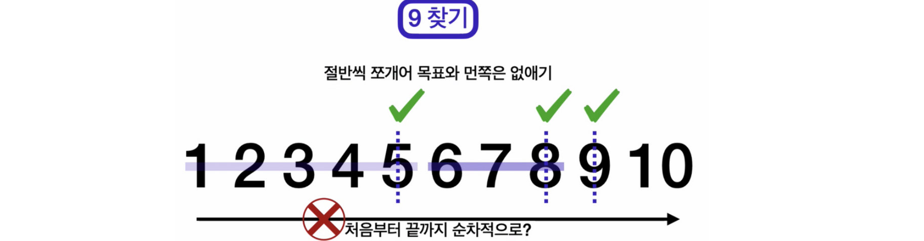 → 9, 10 중 중간값은 9이고 9와 찾는 값 9가 같다! 찾음- 만약 10을 찾는 중이여서 갖지 않았다면 9을 버리고 유일한값 10만 남아서 찾게된다.