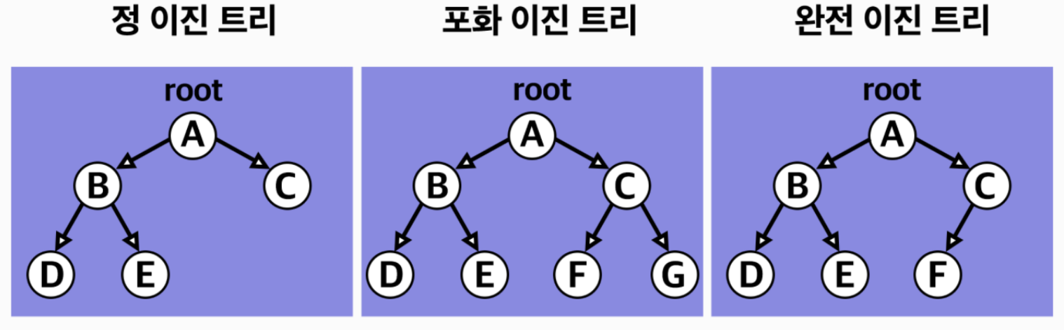 이진 트리는 자료의 삽입, 삭제 방법에 따라 정 이진 트리(Full binary tree), 완전 이진 트리(Complete binary tree), 포화 이진 트리(Perfect binary tree)로 나뉩니다