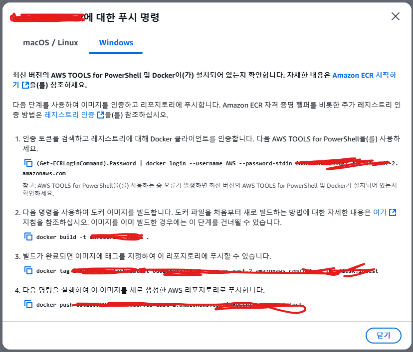 ECR 페이지에 직접 가서 푸시 명령을 보면 고민하지 않고 바로 복붙으로 푸시할 수 있다.