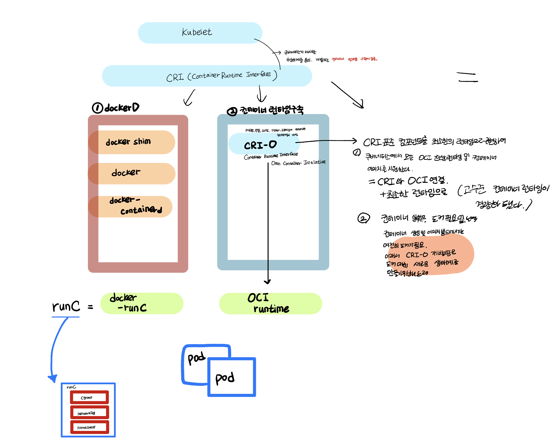 - OCI는 컨테이너 런타임 표준화의 출발점입니다. OCI 가 모든 통일을 하진 않았기에 다양한 컨테이너 런타임이 생성됐습니다. CRI는 쿠버네티스가 다양한 런타임과 통신하도록 설계된 인터페이스입니다.