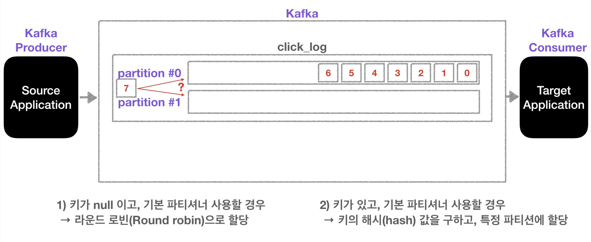 - 파티션이 여러 개일 경우, 키 값이 "Null"이면 "Round Robin"방식으로 시간 순서대로 할당
