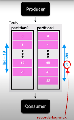 - 한 개의 Topic과 컨슈머 그룹에 대한 lag이 여러개 존재할 때, 그중 높은 숫자의 lag를 "records-lag-max"라고 한다.