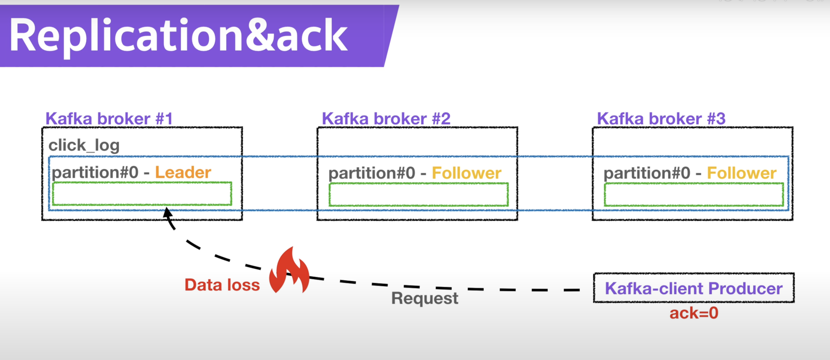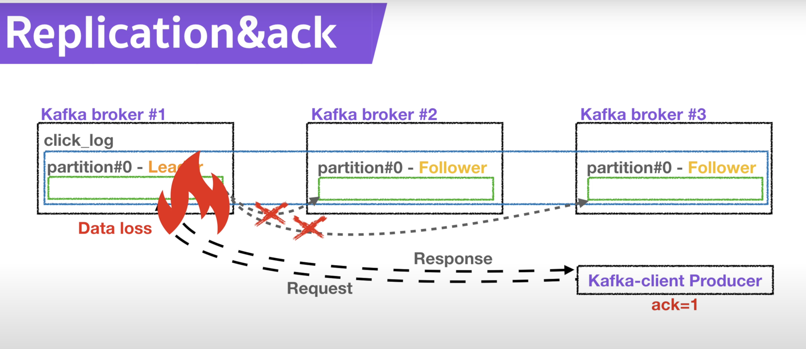 - 만약 복제하기 전에 Leader partition에 문제가 생기면 역시 데이터가 유실될 수 있다.