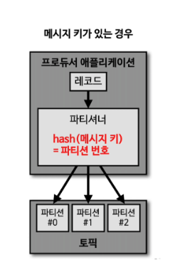 - 피티션이 여러 개일 경우, 키 값이 존재한다면, 키의 해시(hash)값에 맞는 파티션에 할당