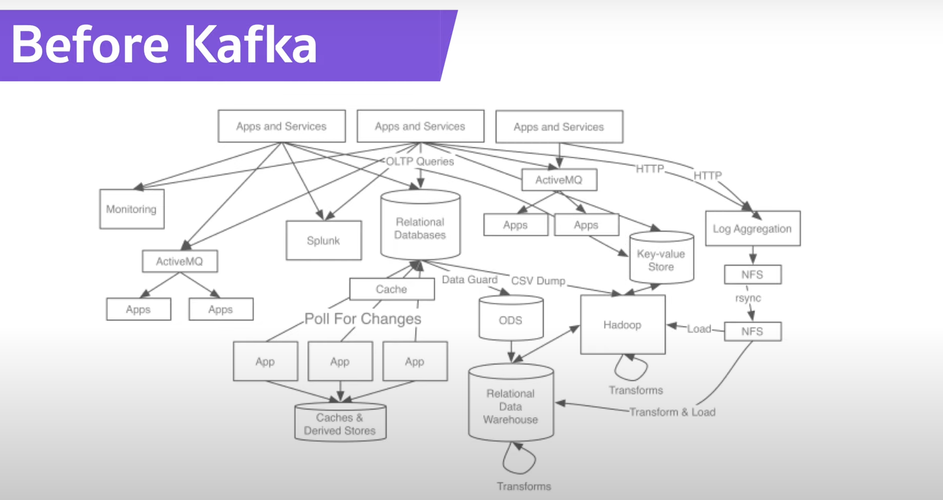 - 카프카가 나오기 전에는 Target Application이 증가하여 "데이터 전송 라인이 많아져, 배포와 장애에 배포하기 어렵다".