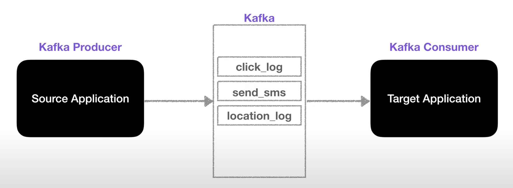 - Source Application은 카프카에 데이터 전송 , Target Application은 카프카에서 데이터를 가져온다.