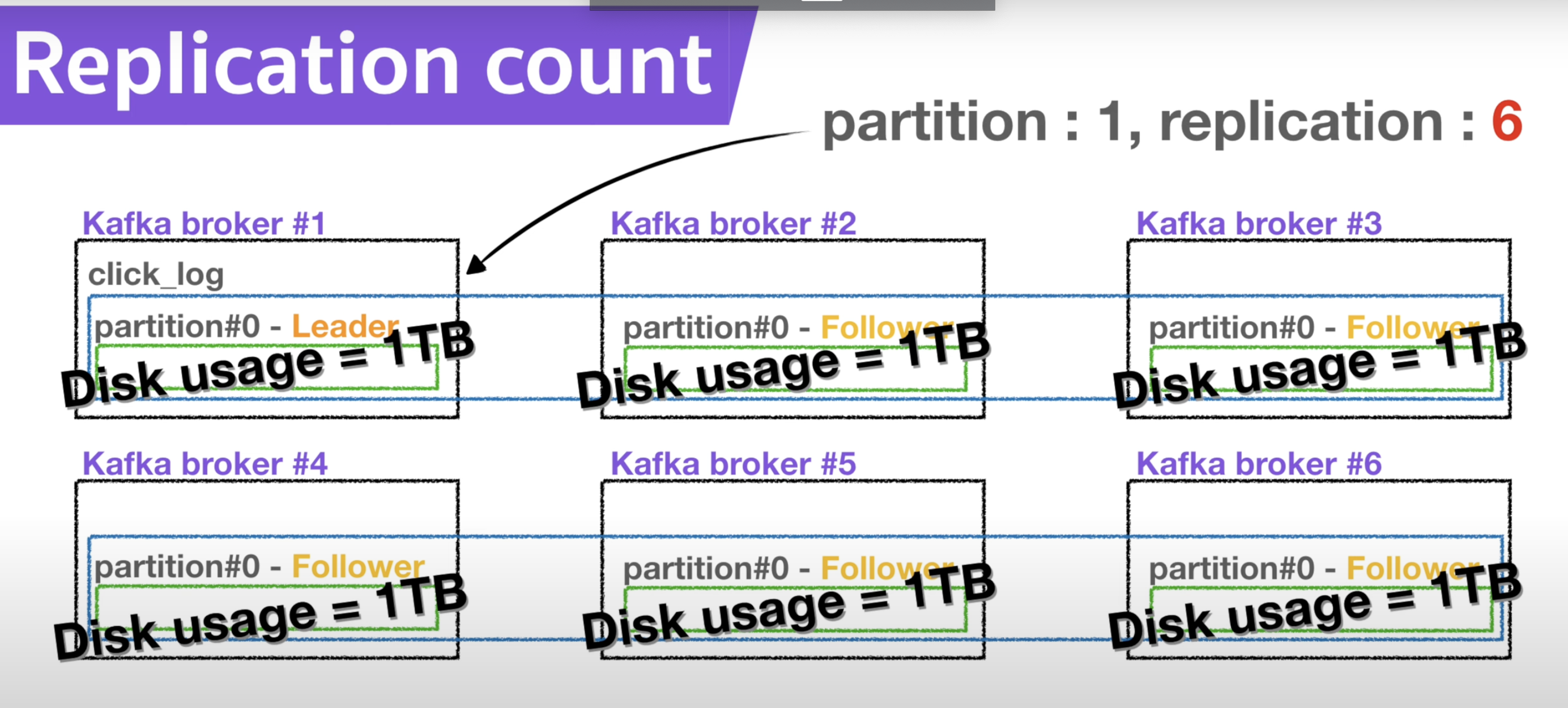 - 카프카에 들어오는 데이터량 과 저장시간(retention date) 을 잘 조절하여서 Replication 갯수를 정해야한다.