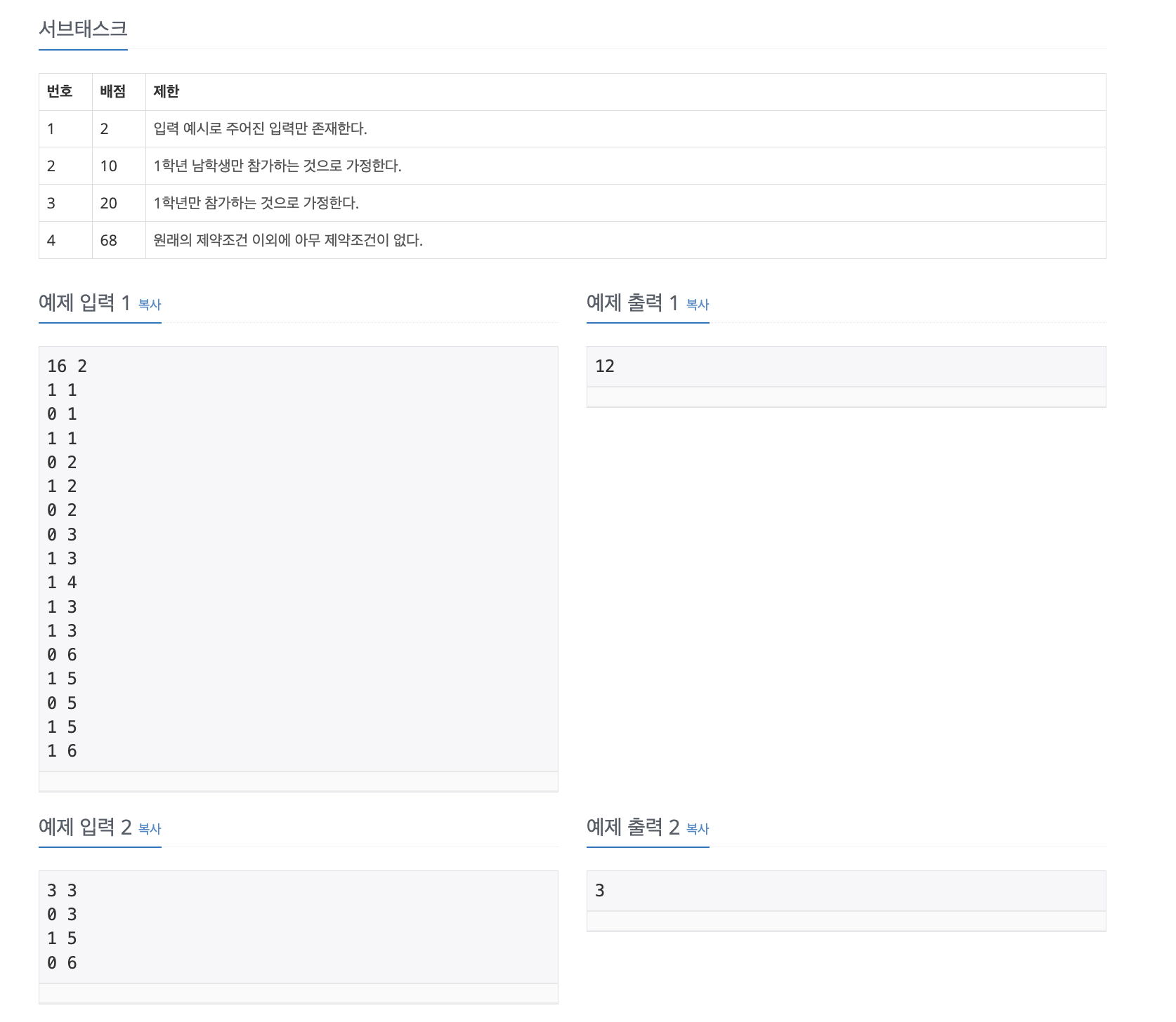 arr[s][g] += 1 # 성별에 해당하는 학년 인덱스 값을 +1