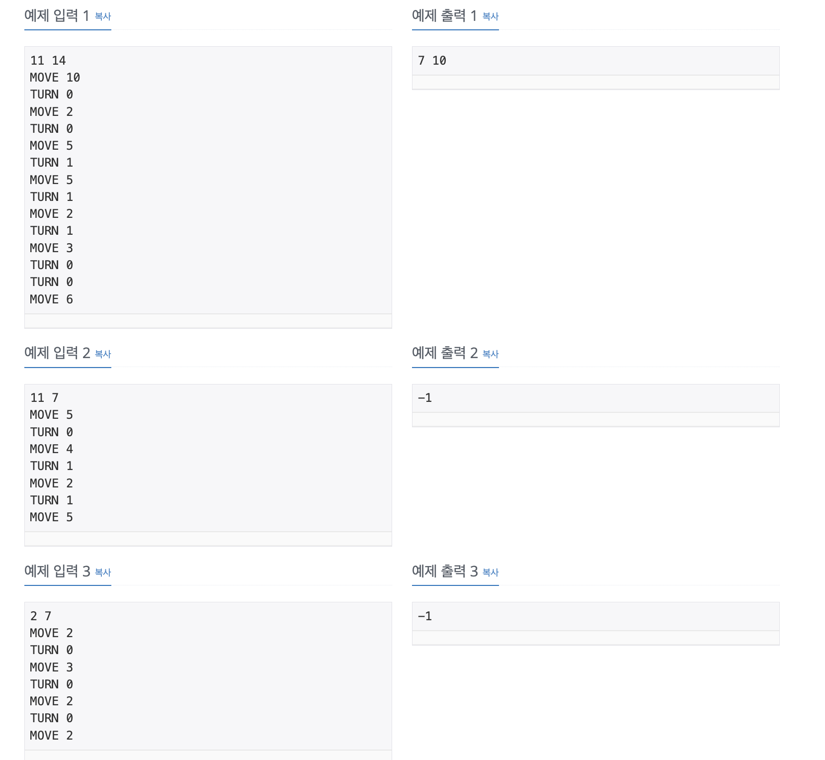 # TURN 0: 왼쪽 90도 회전 / TURN 1: 오른쪽으로 90도 회전 / MOVE d: 해당 방형으로 d이동