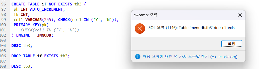 💡 DROP TABLE IF EXISTS 테이블 명 (ex. tb3,tb4)