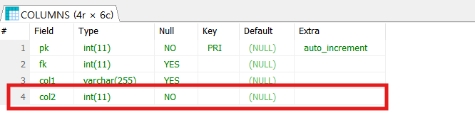 ALTER TABLE tb2 ADD col2 INT NOT NULL;