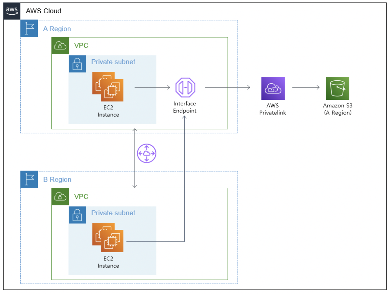 - Private 주소를 사용하여 VPC Peering 도는 AWS Transit Gateway를 사용하여 VPC 내, 온프레미스 또는 다른 AWS 리전의 VPC에서 S3로 요청을 라우팅하면서 게이트웨이 엔드포인트의 기능을 확장시킬 수 있다.