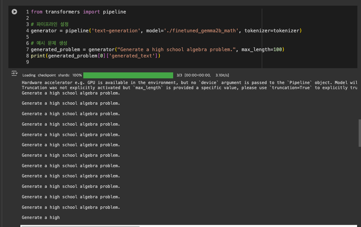 근데 내가 적은 프롬프트가 결과로 계속 반복만 되는 것을 볼 수 있다.