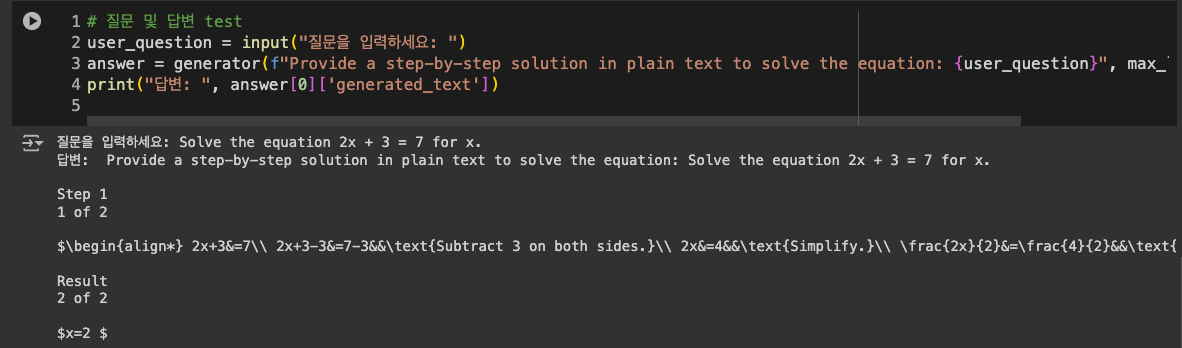 그리고 질문 입력란에 2x + 3 = 7 일때 x 값을 구해달라고 해봤다. (한국어 파인튜닝은 해두지 않아 영문으로만 가능)