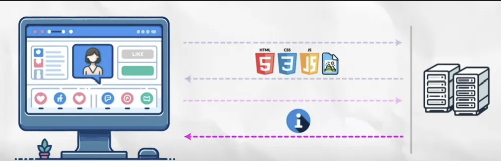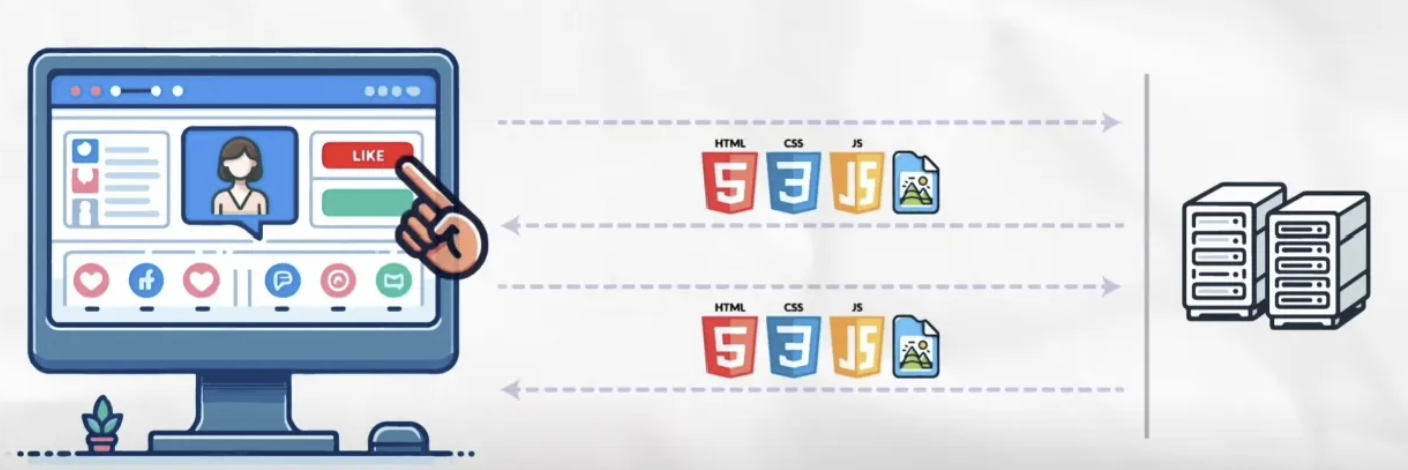 AJAX 등장 이전에는 ‘좋아요 버튼’의 상태 변화를 나타내기 위하여 서버로 요청을 보내고 상태 변화할 요소 포함 해당 페이지의 모든 화면 구성 요소들을 다시 받았다.