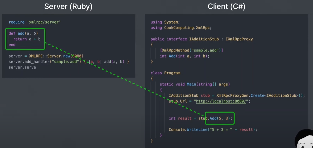 위의 예시의 경우, 서버는 RUBY, 클라이언트틑 C#으로 작성되어있다.